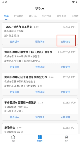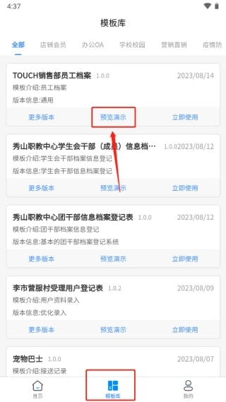 1、点击模板库,选择适宜的档案模板,如touch销售部员工档案,点击预览演示