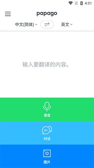 papago软件采用了全新的AI智能系统,支持语音识别、机器翻译和文字识别等翻译功能,用户可以通过打字、语音、拍照等多种方式输入需要翻译的内容,就可通过人工智能技术进行书译和口译功能,让每一位用户可以真正体验翻译工具的强大。同时,Papago还支持用户对翻译结果进行反馈和修改,以不断提高翻译质量,对此,有需要的朋友们欢迎你来本站使用!