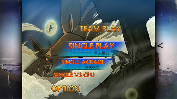1、启动游戏并进入主界面,这里包含【TEAM PLAY】联机模式、【SINGLE PLAY】单人模式、【SINGLE ACRADE】闯关模式与【SINGLE VS CPU】人机对战模式,玩家可根据需求自由选择,以下将以【单人模式】为例进行说明。