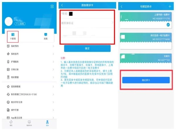 1、打开“闵行捷医”,点击“我的”,进入“卡管理”,添加“闵行区统一自费就诊卡”进行绑卡。