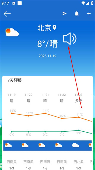 3、在天气页面点击喇叭图标,即可播报当前的天气信息。