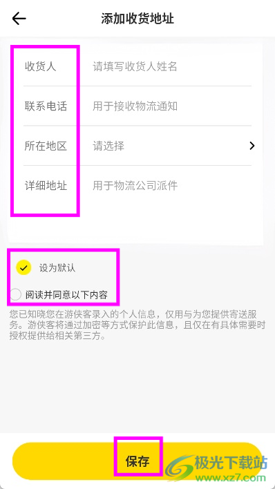 4、进入添加页面后,依次填写姓名、电话、地区和地址信息,然后点击【保存】按钮。