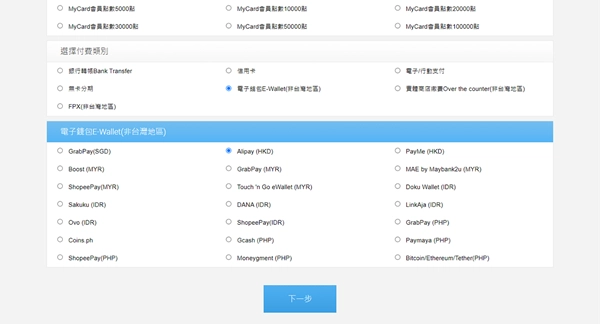 3、选择MyCard品项及付费类别。