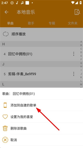 3、在歌曲操作菜单中点击【添加到自建的歌单】,可将歌曲加入自建歌单。