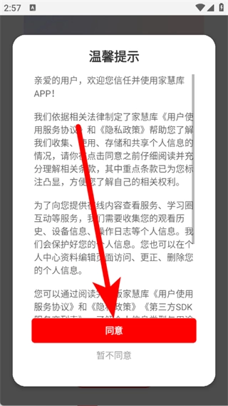 1、启动家慧库应用,当出现温馨提示的弹窗时,点击弹窗中的“同意”按钮。