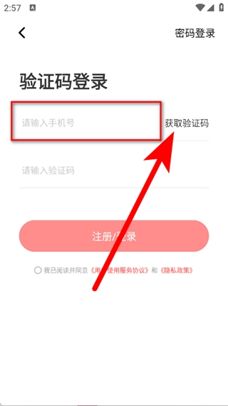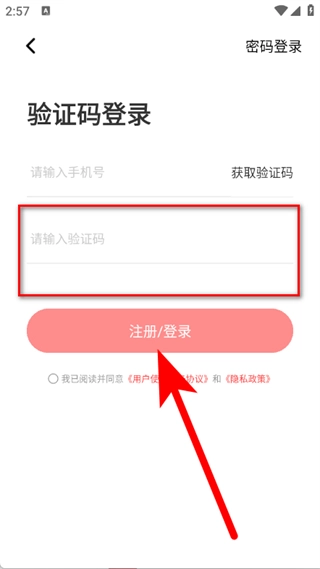 4、输入收到的验证码,勾选同意后,点击注册登录按钮,完成账号登录。