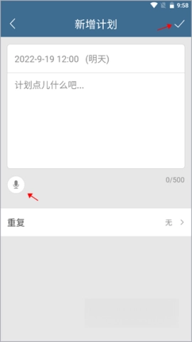 2、接下来你可以手动输入或通过语音快速记录下未来的计划,是否设置为重复计划也能根据需要自由选择,点击右上角的“√”即可完成添加。