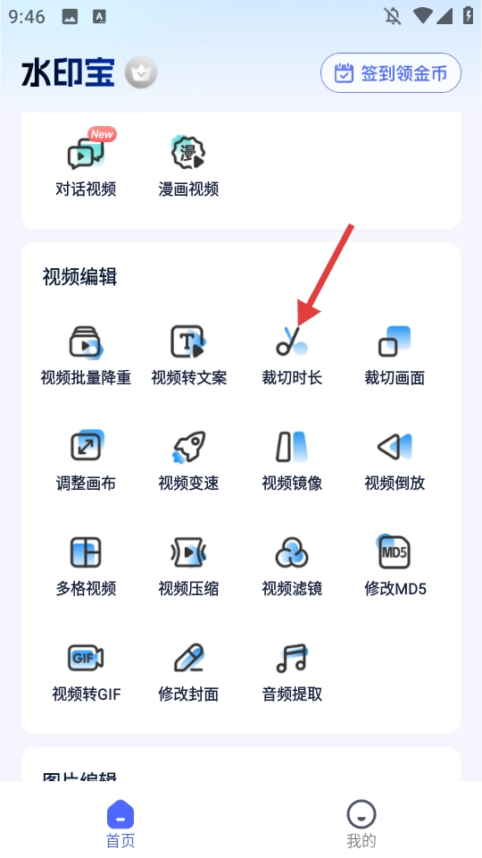 1、进入视频编辑板块后,点击【裁切时长】按钮,即可跳转至素材选择页面。