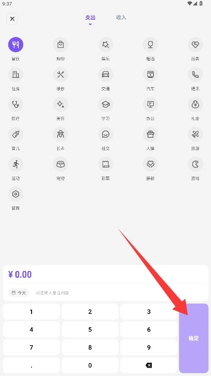 4、选择收支类型和具体分类项目,填写金额并添加备注后点击确定保存账单记录。