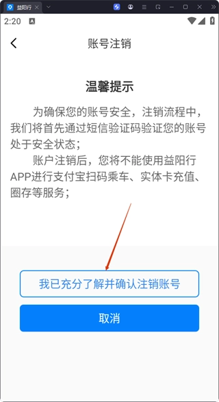 4、在账号注销界面,点击【我已充分了解并确认注销账号】按钮,可提交账号注销申请。