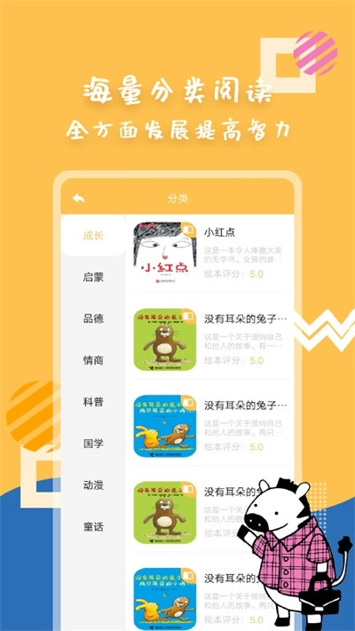 1. 内容多元丰富:涵盖启蒙、成长、品德、情商、科普、国学等主题的绘本,以及卡通童话、儿童文学、国学经典、奇幻冒险等主题的故事。搭配高品质原创插图,为孩子打造集听、看、互动于一体的绘本阅读体验。