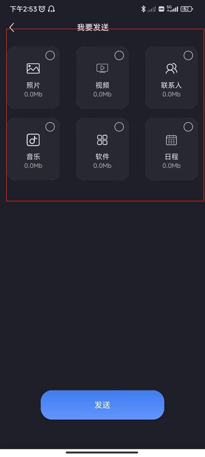 进入发送页面后可以看到有六项内容选项,用户根据需求选择后,点击底部发送即可开始互传