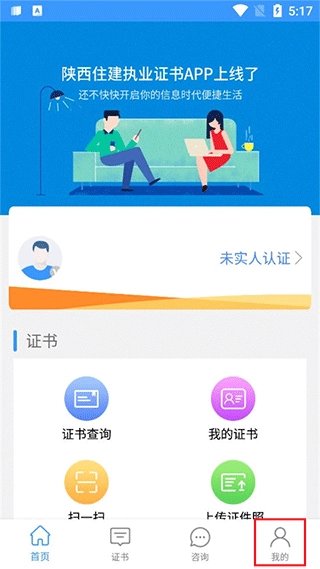 首先打开陕西住建执业证书最新版,点击右下方【我的】