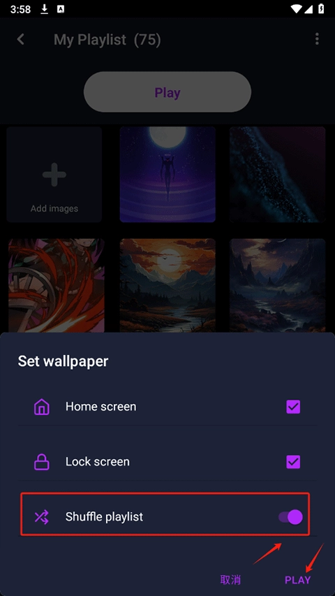 4、然后选择将这些壁纸设置为壁纸、锁屏或全部都设置,并将三个自动播放功能打开,设置完成后点击play