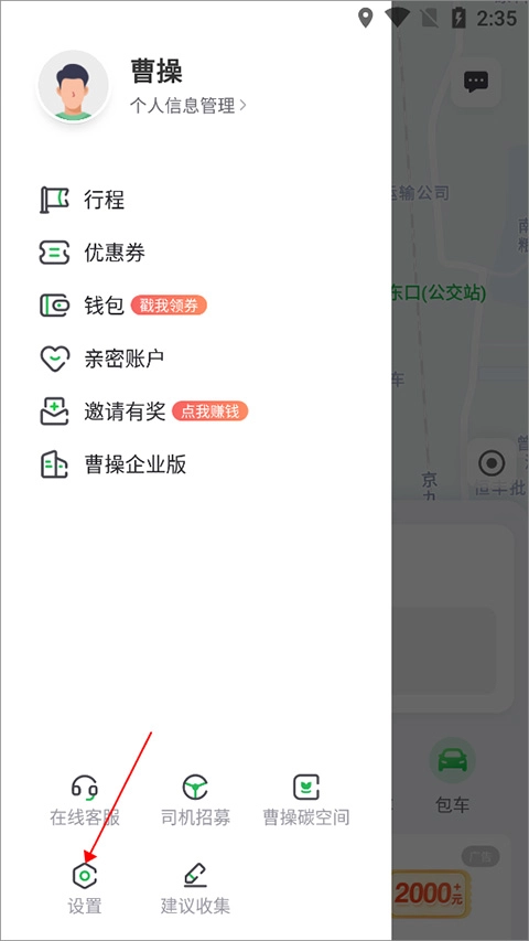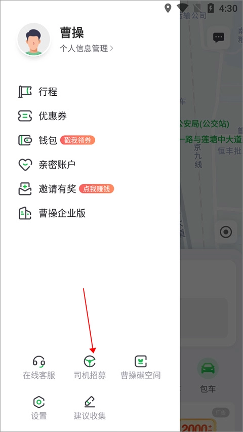 2、在左侧弹出的面板中点击底部的【司机招募】(下图红色箭头所指)