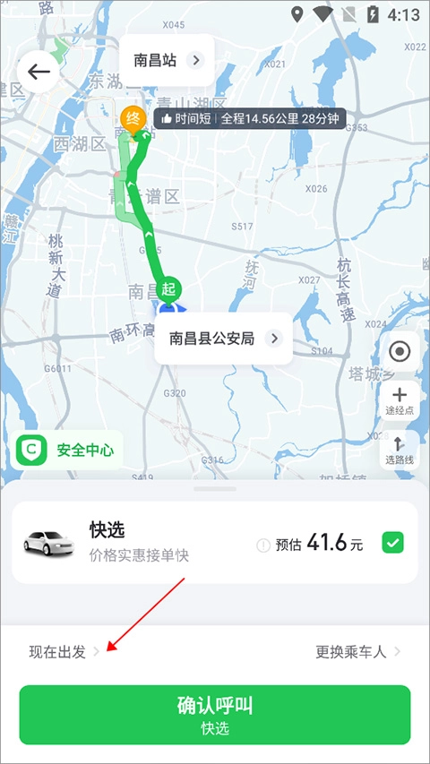 2、接着在打开的新页面中,会显示路线图和车型、预估费用,用户需要点击【现在出发】(下图红色箭头所指)确认下出发时间