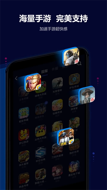 王者荣耀、绝地求生:刺激战场、和平精英、pubg外服、英雄联盟LOLM、钢铁力量、传说对决、穿越火线、战争机器人、QQ 飞车等热门游戏均支持加速。新游上线联系客服即可快速添加,开启畅玩。