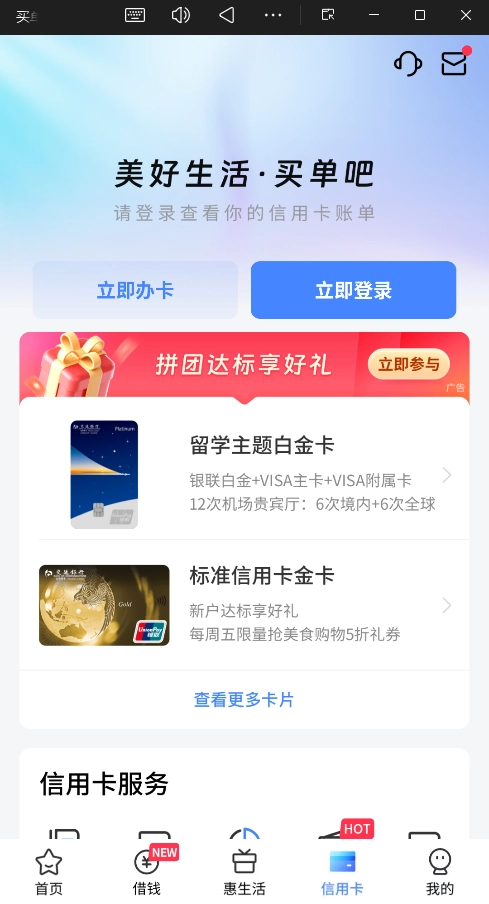 申请新卡:在“立即办卡”区域,可以浏览并申请各种类型的交通银行的信用卡,如“留学主题白金卡”、“标准信用卡金卡”等,享受不同的开卡礼遇。