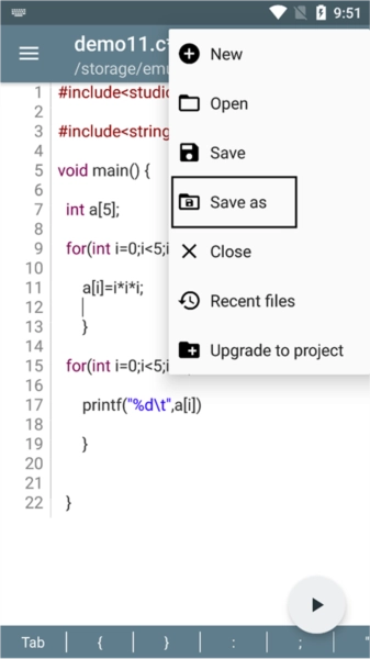 2、把要运行的代码输入进去,点击文件夹图标,选择“Save as”选项,给c文件起个名字并保存,要留意文件后缀的填写。