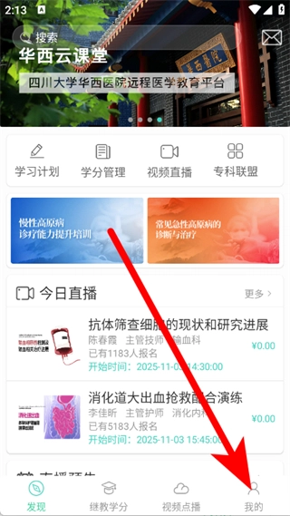 1、启动华西云课堂应用,点击底部导航栏中的“我的”选项,进入登录界面。