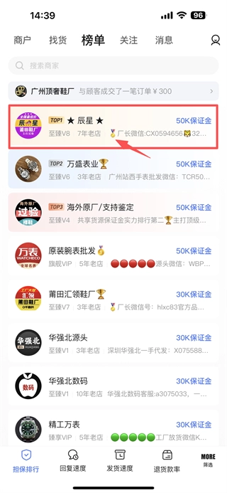 2、在榜单页面,点击TOP1的辰星商家条目,进入商家店铺页面。