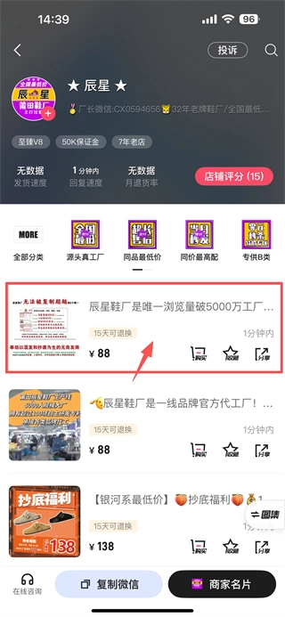 3、在商家店铺页面,点击辰星鞋厂是唯一浏览量破5000万工厂商品条目,进入商品详情页面。
