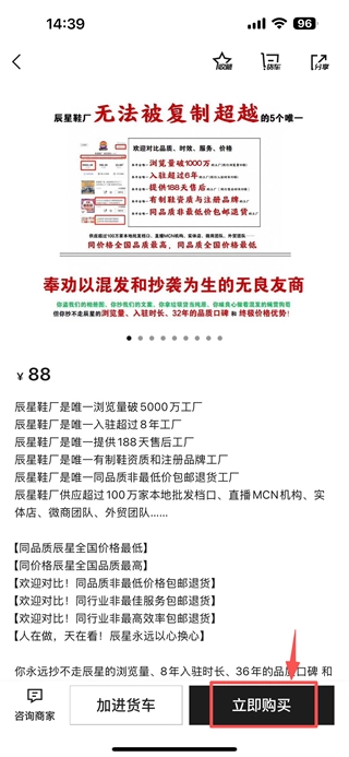 4、在商品详情页面,点击立即购买按钮,即可完成该商品的选购操作。