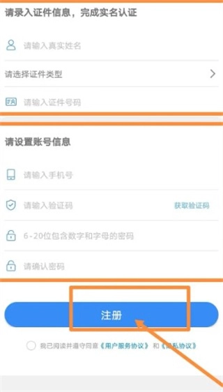3、输入姓名证件号码,手机号等信息后,点击注册。