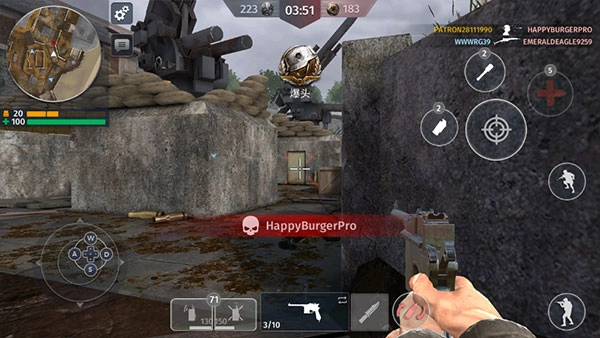 3、进入游戏后,操作非常简单,左边控制移动方向,右边控制射击、开镜、换弹等等;