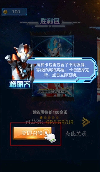 1、每种卡包里包含了不向强度、等级的奥特英雄,卡包选择完毕,点击立即召唤。