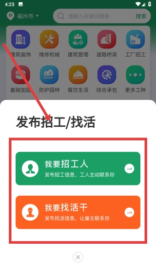 2、发布招工找活弹窗,设有我要招工人、我要找活干两大功能按钮,前者方便雇主发布招工信息,后者便于工人发布找活信息。