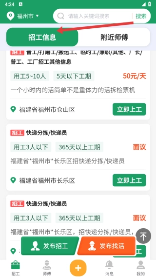 3、招工信息页面,显示所在城市为福州,可搜索相关工种,展示普工、快递分拣等招工岗位详情,含用工人数、工期、薪资、地点等。