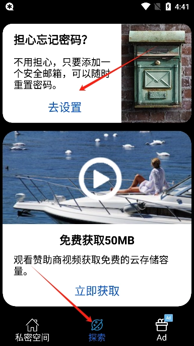 4、接下来我们点击“探索”选项,你可以在此处新建一个安全邮箱,有了它就能随时重置你的密码了