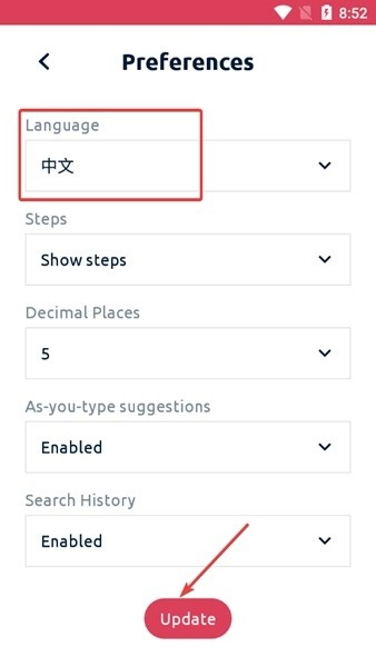 3、把language调整为中文,完成后点击下方的update按钮就可以了。