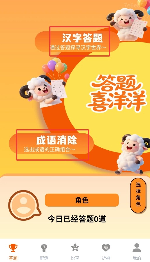 1、应用与内容选择:安装答题喜洋洋极速版应用,进入首页选择汉字答题、解谜天地或笑话大全等板块。