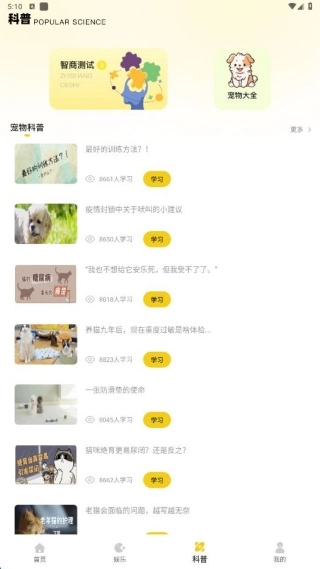 4、在科普页面,我们能通过资讯,了解宠物品种和生活习惯等科普知识。
