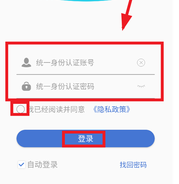 输入统一身份认证账号和密码,勾选“我已经阅读并同意《隐私政策》”后点击登录按钮,即可完成登录操作。