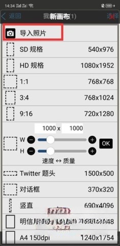 2. 在新建画布选项中,您可以选择导入照片,为后续的创作奠定基础。