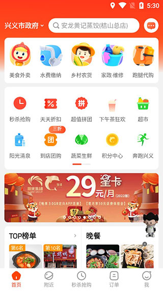 1、安装好软件,打开进入首页,有美食外卖、水费缴纳、乡村农货、家政维修、跑腿代购,还有秒杀抢购、拼团等,买菜去超市都可以在里面找到。