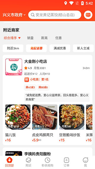 4、附近商家,小吃、米饭、烧烤、简餐等等类别的店铺,还有活动免配送费哦。