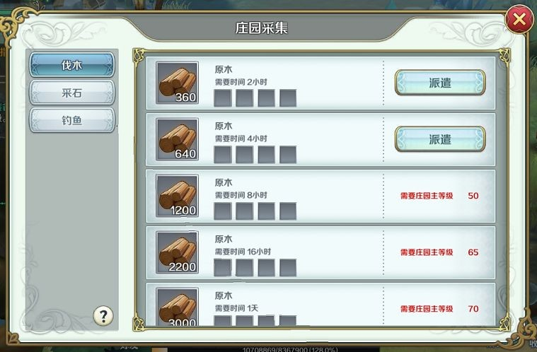 在庄园中,伐木、采石、钓鱼这些采集玩法都是不需要冒险家手动进行的。