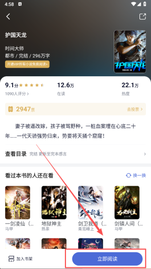 2、轻触“立即阅读”按钮,系统将为您打开选定的小说,让您尽情享受阅读乐趣。