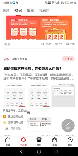 【卡友圈】:江淮车友发布最新车辆体验信息,工作人员发布最新车辆资讯,车友可以在卡友圈进行互动评论点赞,参与社区活动与话题,分享你在江淮卡友的每个精彩瞬间,加关注即可了解好友的最新动态。
