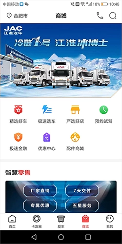 【商城】:江淮卡友整车商城和智慧零售及配件商城为一体,通过平台不仅提供了金融服务,同时恶意预约试驾,电话沟通,一键导航到心仪的经销商,平台会不定期推出砍价、优惠券等优惠活动,智慧零售平台将会推出部分车款,用户可以全线上下单体验购车,更加实惠省心。配件商城保证江淮原厂纯正配件的同时,会不定期推出配件及服务的优惠活动,卡友们可以关注其商城最新的动态。