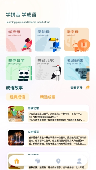 首页设置了丰富的学习内容,涵盖学声母、学韵母、学字母、整体音节、拼音儿歌、名师好课等板块,同时也收录了各类成语故事。