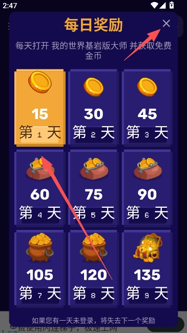 4、领取每日签到奖励,点击右上方的x关闭,进入启动器首页。