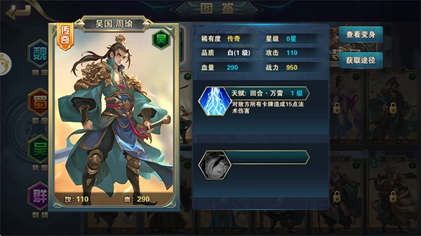 2、大致打法:通过站场,消耗对手卡牌获胜,单一回合爆发极高,完全能团灭对方。首先周瑜必须飞升提供50%加伤的借法技能;孙策由于是绝世卡,技能等级很难升级;回合输出的重任就来到了孙权,小乔这里;