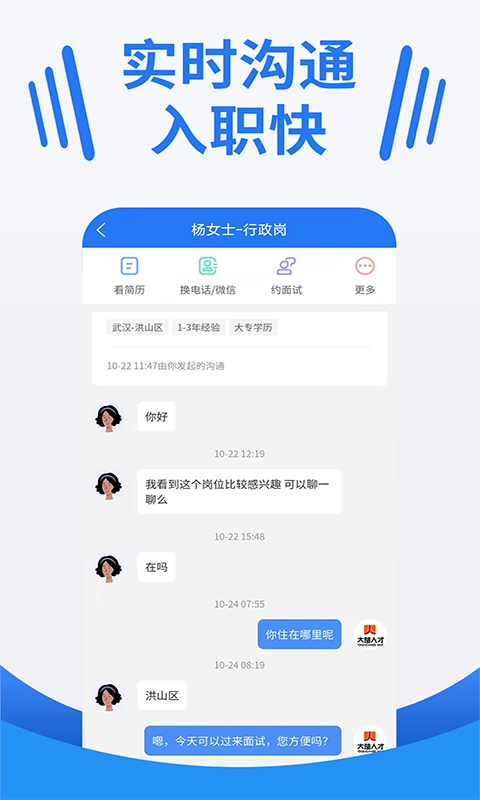 3、支持求职者与企业在线即时交流,采用简洁易用的界面设计,让求职沟通变得更加的高效。