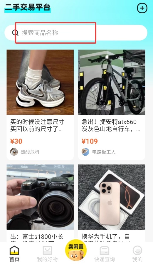 2、在首页搜索栏中输入商品关键词,即可快速查找所需二手物品信息。