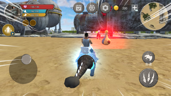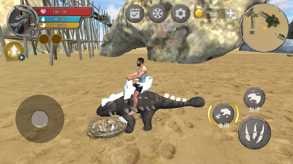 1、玩家操控角色骑乘恐龙在岛屿上展开探索,通过移动、加速等按钮搜寻其他恐龙,靠近目标后借助食用等功能将其吞噬。